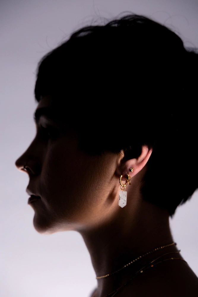 Brinco assimétrico com folha natural de samambaia e ponta de cristal de quartzo, rutilado com turmalina negra. Versátil: os pingentes são removíveis, permitindo que a argola também seja usada separadamente.