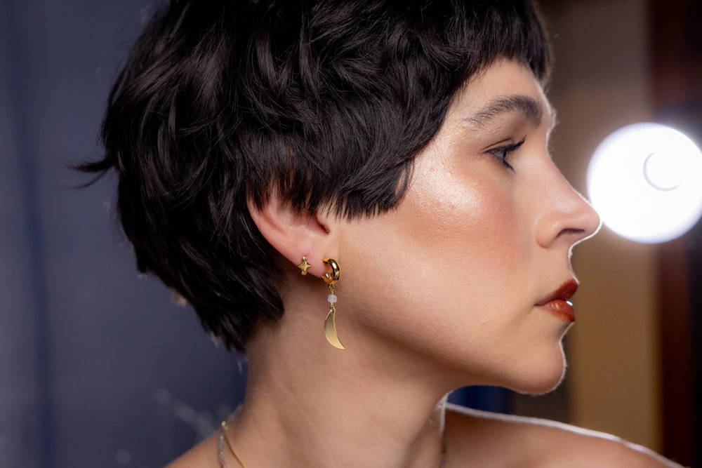 Composição: brinco assimétrico, com cristais de pedra da lua e flor de miosótis preservada em resina epóxi.