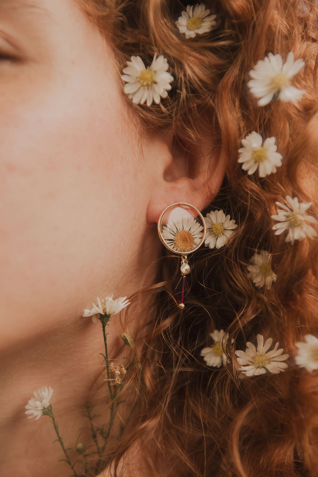 Composição: Biojoia com cristais naturais de granada e inflorescência de margarida preservada em resina epóxi.