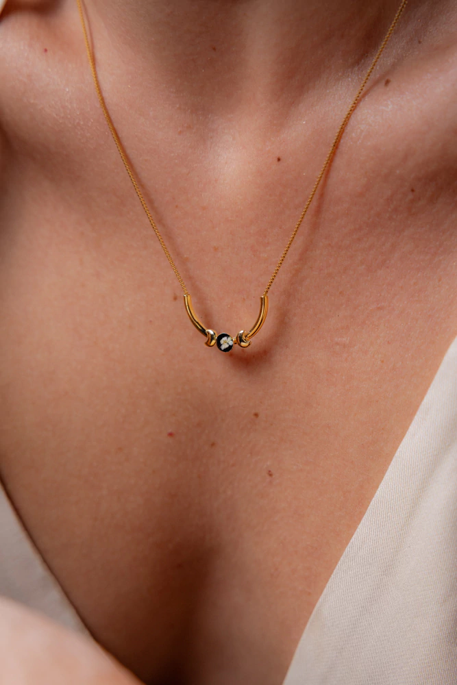Composição: biojoia com flor de cenoura natural preservada em resina epóxi, em fundo preto. Pingente em tubo, com duas delicadas luas laterais.
