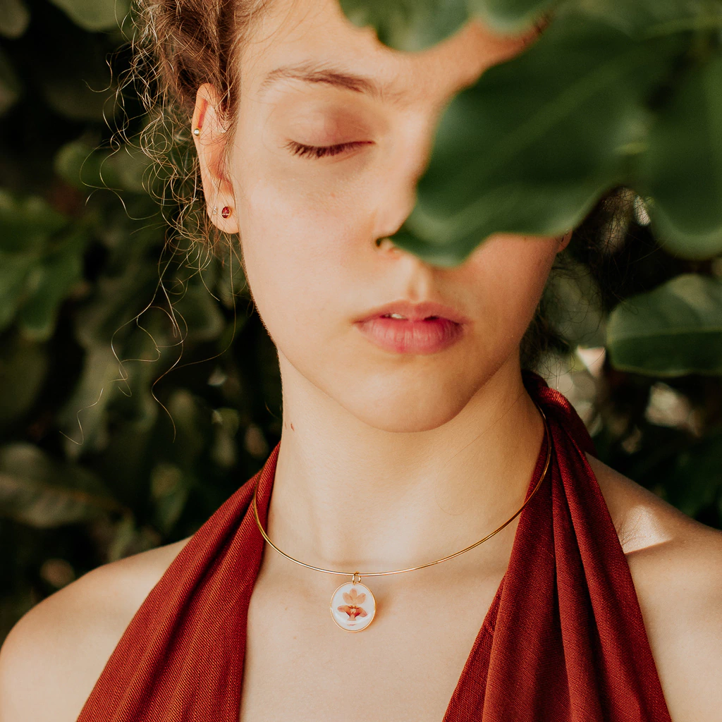 Composição: Biojóia com flor natural de orquídea reservada em resina epóxi.