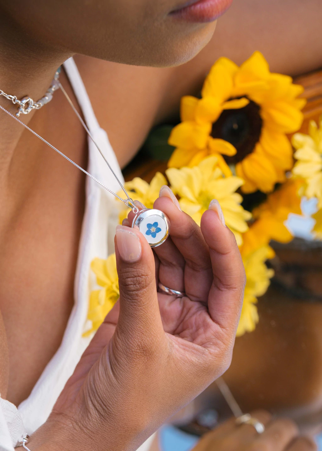 Composição: biojoia com flor natural de miosótis (não me esqueças), desidratada e preservada em resina epóxi.